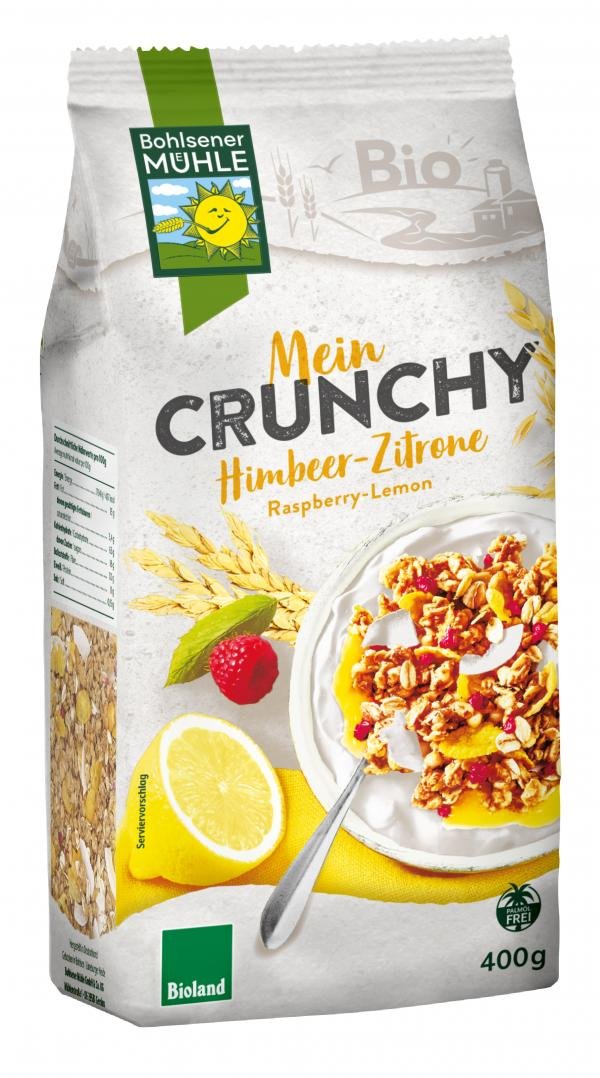 Das Getreide aus der Region wird in unserer Wassermühle in Bohlsen zu Flocken verarbeitet, bevor es zu knusprigem Joghurt-Zitronen-Crunchy aus Hafer und Dinkel gebacken wird. Gemischt mit fruchtigen Himbeeren und gerösteten Kokoschips für ein zitronig-frisches Geschmackserlebnis – Mein Crunchy. Mein Genussmoment.