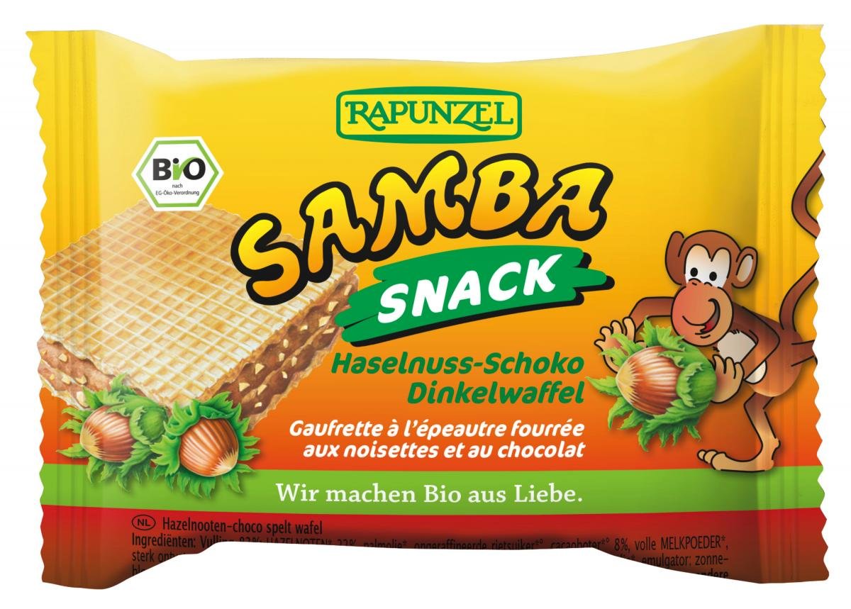 Knackige, frische Dinkelwaffeln gefüllt mit Haselnuss-Schoko-Creme - ein knuspriger Snack für Groß und Klein. 26% Haselnüsse machen die cremige Samba-Füllung so lecker und aromatisch. Verfeinert mit echter Bourbon-Vanille.