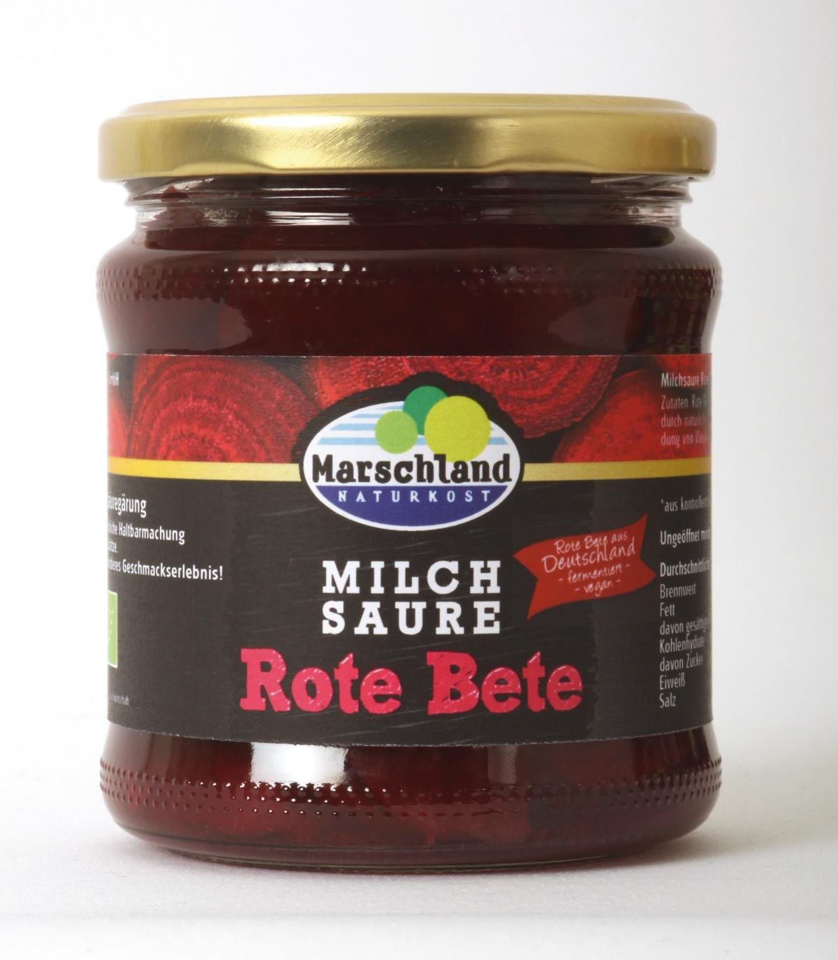 Tafelfertig zubereitete biologische Rote Bete in Streifen geschnitten, die einer natürlichen Milchsäuregärung in einer Salzlake unterzogen worden sind und später durch Pasteurisation im luftdicht verschlossenen Behältnis dauerhaft haltbar gemacht worden sind.