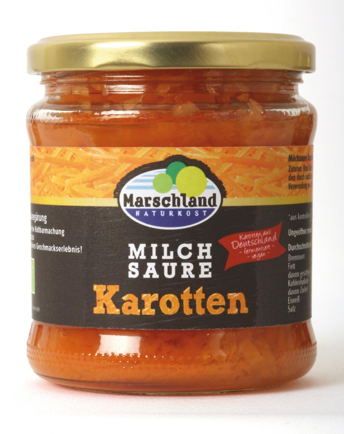 Tafelfertig zubereitete biologische Karotten, in feine Streifen geschnitten, die einer natürlichen Milchsäuregärung in einer Salzlake unterzogen worden sind und später durch Pasteurisation im luftdicht verschlossenen Behältnis dauerhaft haltbar gemacht worden sind.