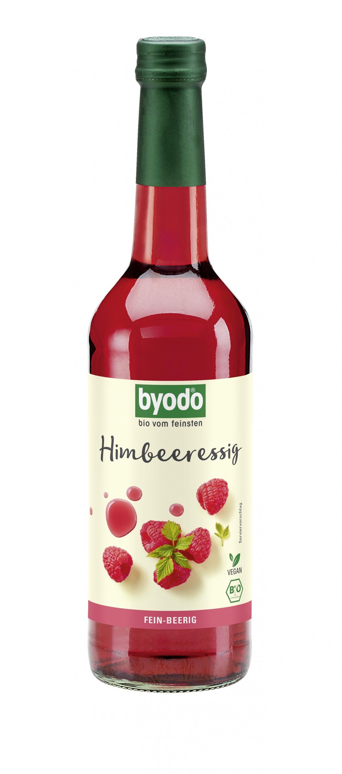 Dem Byodo Himbeeressig (5% Säure) geben reife Bio-Himbeeren den intensiv-beerigen Geschmack und die schöne, leuchtend-rote Farbe. Diese werden zu feinem Himbeerwein und Himbeerkonzentrat verarbeitet. Der Wein wird anschließend bei angenehm warmen Temperaturen langsam zu Essig vergoren. Dieses Verfahren nennt man eine kontinuierliche Essigvergärung.