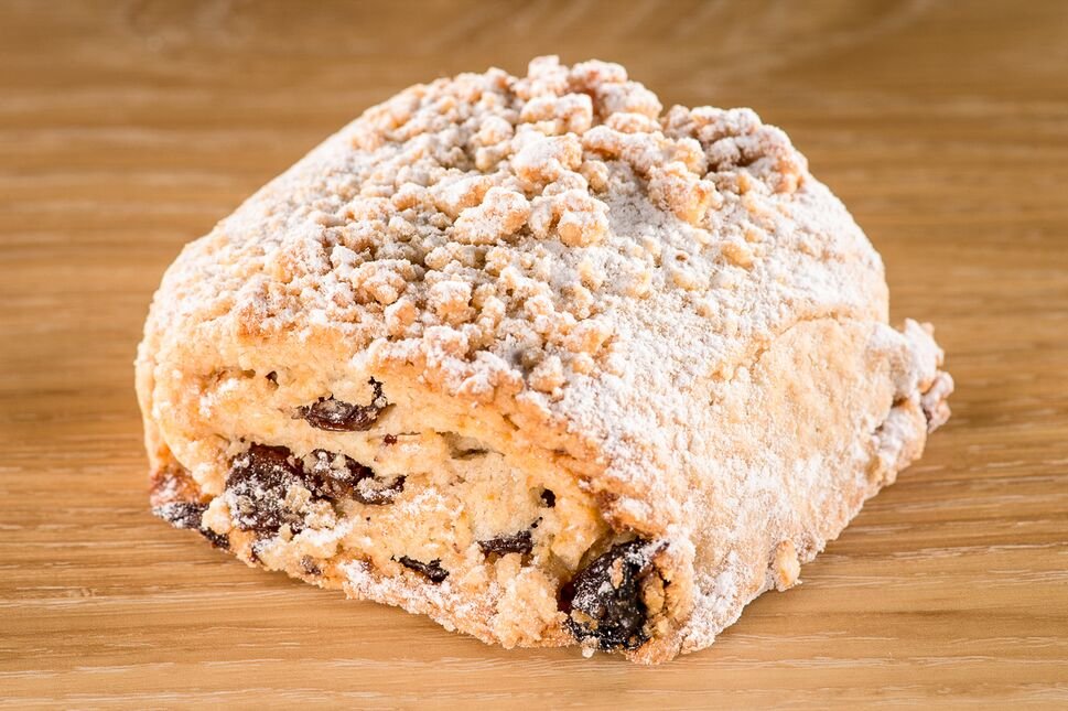 Butter, Rosinen, Dinkelmehl, Zucker, Honigmarzipan (Mandeln, Bienenhonig, Wasser), Haselnüsse, Wasser, Aprikosenfruchtaufstrich (Zucker, Aprikosen, Säuerungsmittel: Citronensäure, Geliermittel: Pektin), Weinsteinbackpulver (Monokaliumtartrat, Backtriebmittel: Natriumhydrogencarbonat, Maisstärke), Meersalz, Zimt, Vanille, Dekorschnee(Rohrohrpuderzucker, Dextrose, ungehärtetes Palmfett, Maisstärke)