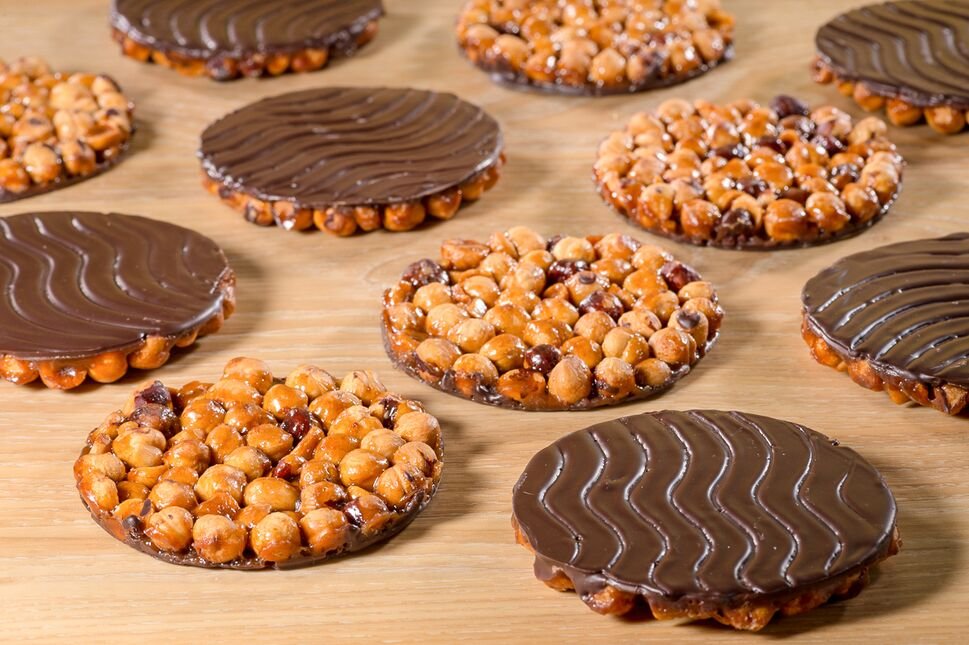 Haselnüsse, Zucker, Sahne, Schokolade (Kakaomasse, Rohrohrzucker, Kakaobutter), Butter, Blütenhonig