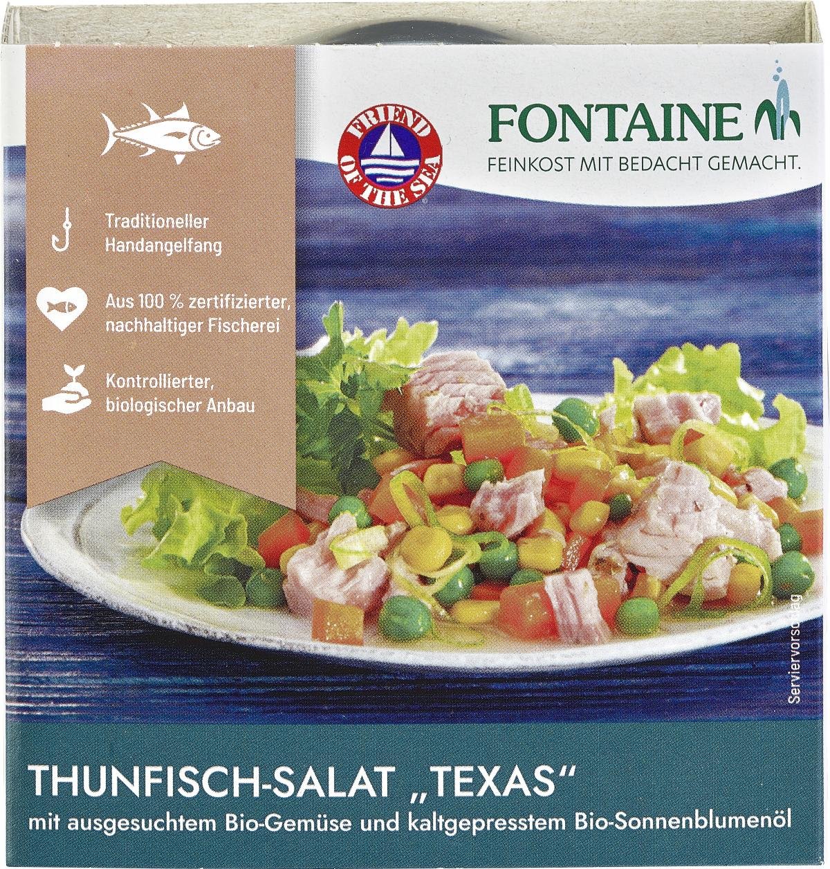 Kalorienbewusste freuen sich: Thunfisch – und ganz besonders der von uns verwendete Echte Bonito – hat mit unter 2% einen sehr geringen Fettanteil. Im Zusammenspiel mit Gemüsen, Gewürzen, Kräutern und Sonnenblumenöl aus kontrolliert biologischem Anbau sind Fontaine Thunfischsalate damit ideal für die leichte kleine Mahlzeit zwischendurch – oder als delikate Ergänzung zu allen Arten von Salatblättern.