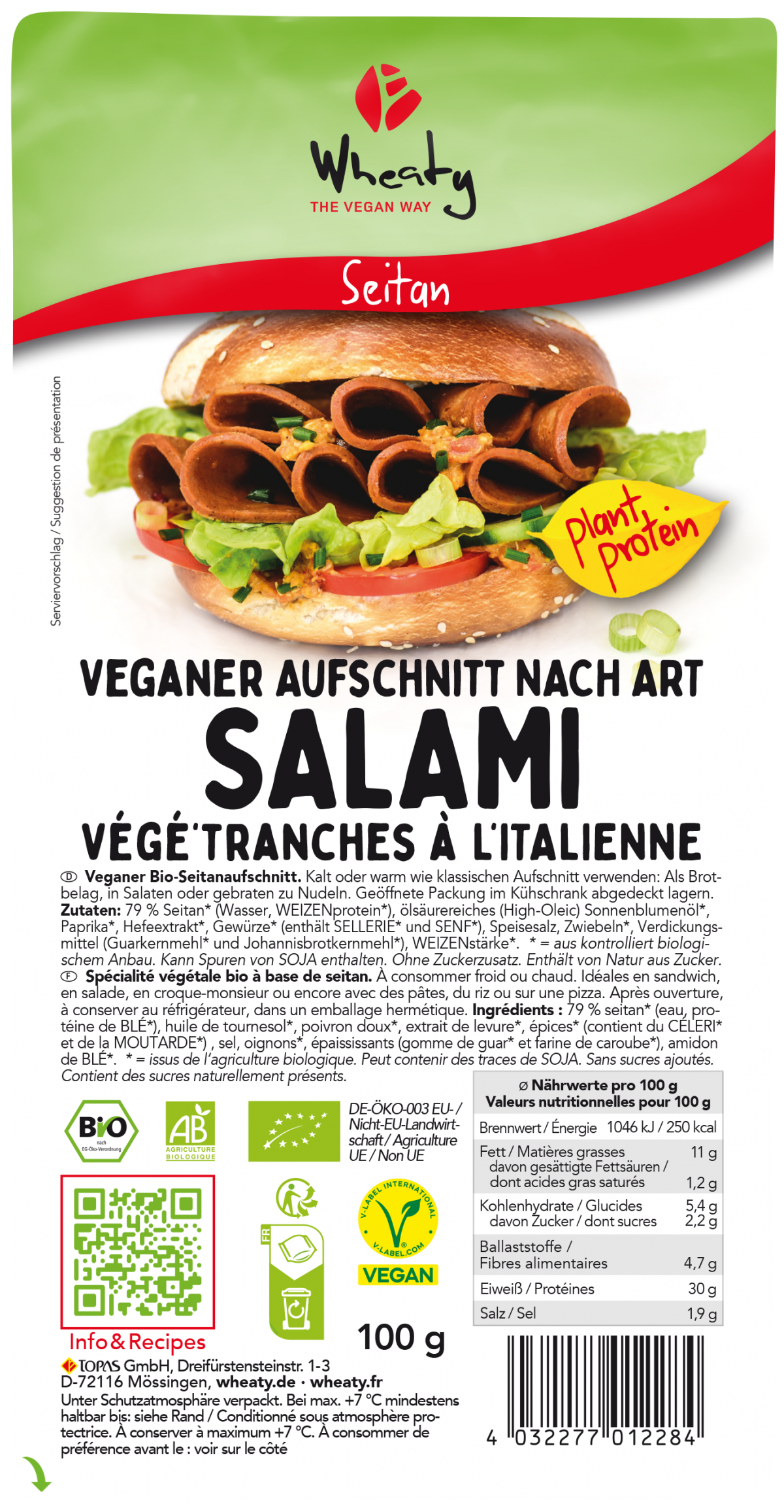 Wheatys vegane Alternative zur klassischen Salami. Traditionell gewürzt und fein in der Konsistenz. Ein echtes Geschmackserlebnis, das dank seiner pflanzlichen Zutaten kein Tierleid verursacht. Würzig, leicht pikant, mit einer Paprikanote. Der perfekte Brotbelag, auch als Pizzabelag oder als Topping im herzhaften Salat geeignet. Geöffnete Packung im Kühlschrank abgedeckt lagern