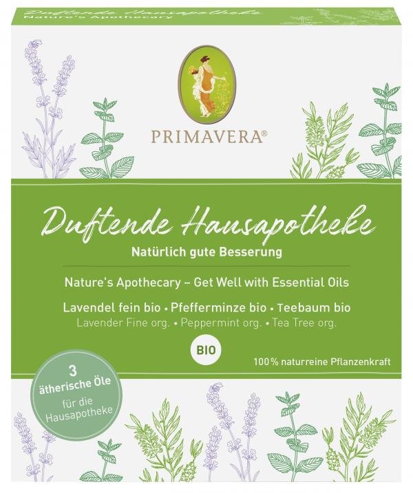 Inhalt 3x5ml Ätherische Öle: Lavendel fein bio 5ml, Teebaum bio 5ml und Pfefferminze bio 5ml