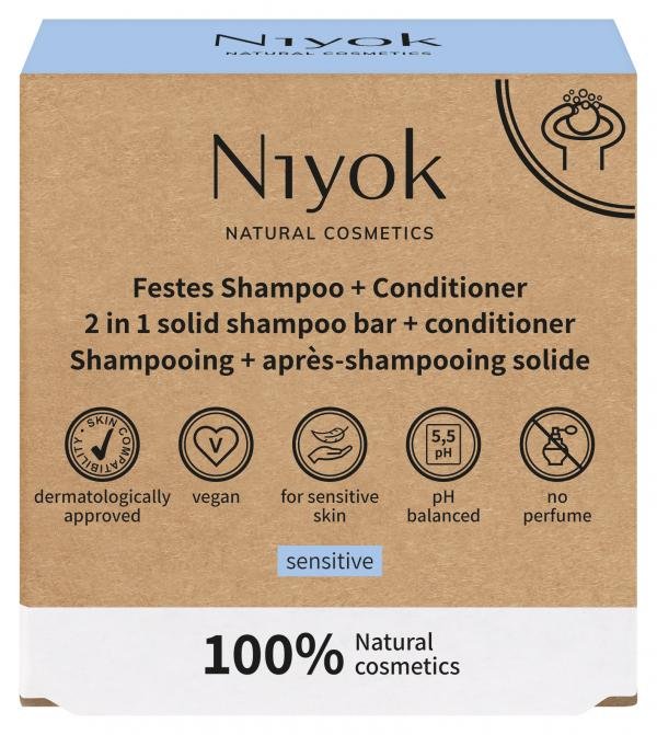Ein festes Shampoo ohne Duftstoffe: Das feste 2 in 1 Shampoo von Niyok besitzt dank der speziellen Formulierung eine Conditioner-Funktion, die die Haare besonders weich und kämmbar machen. Es spendet reichlich Feuchtigkeit und schenkt dem Haar natürliches Volumen. Mit einem pH-Wert von 5,5 ist es hautneutral und damit besonders sanft zu deiner Kopfhaut.