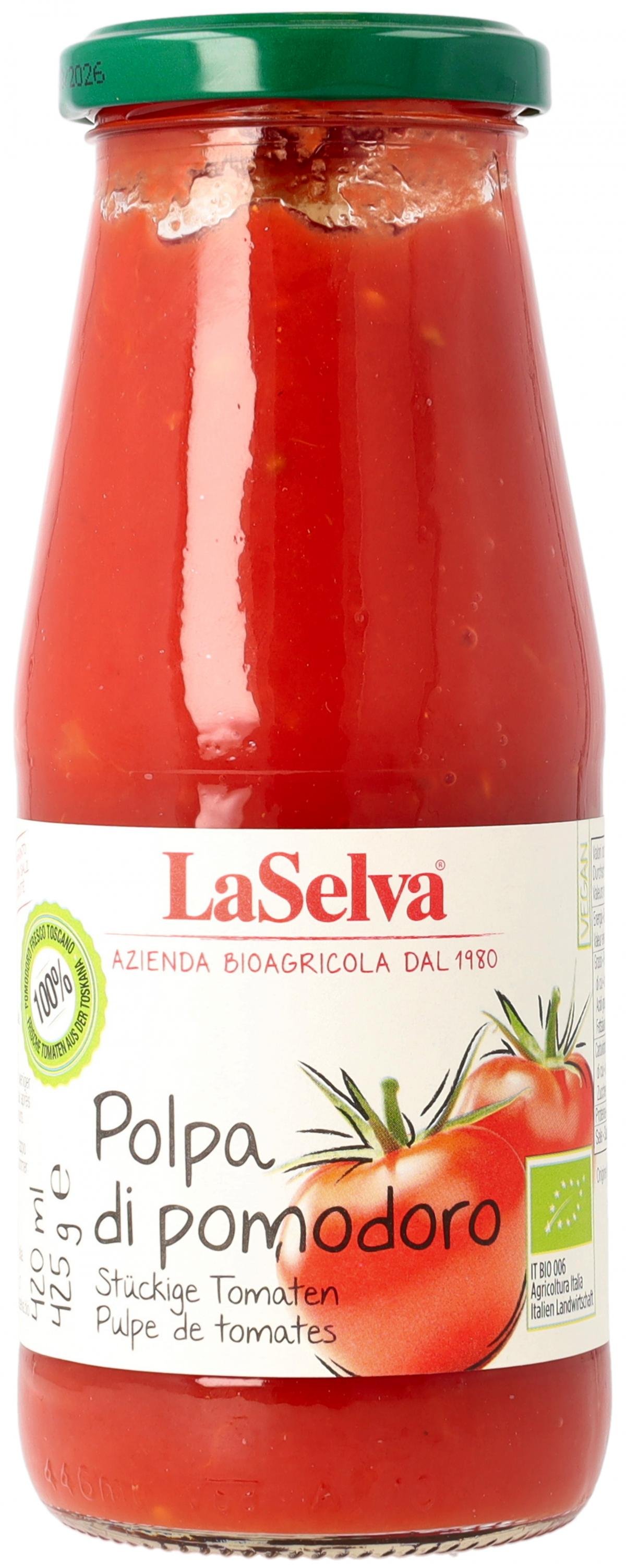 100 % Tomaten aus der Toskana, ohne Zusatz von Salz - Intensive Sonnenstunden schenken den Bio-Feldfrüchten ein unverwechselbares Aroma und viele primäre und sekundäre Pflanzenstoffe. Für Polpa werden sie geschält und gehackt, Fruchtfleisch und Kerne bleiben enthalten. In der eigenen Verarbeitung von LaSelva bleibt die Naturbelassenheit durch eine schonende Dampfpasteurisierung weitgehend erhalten.