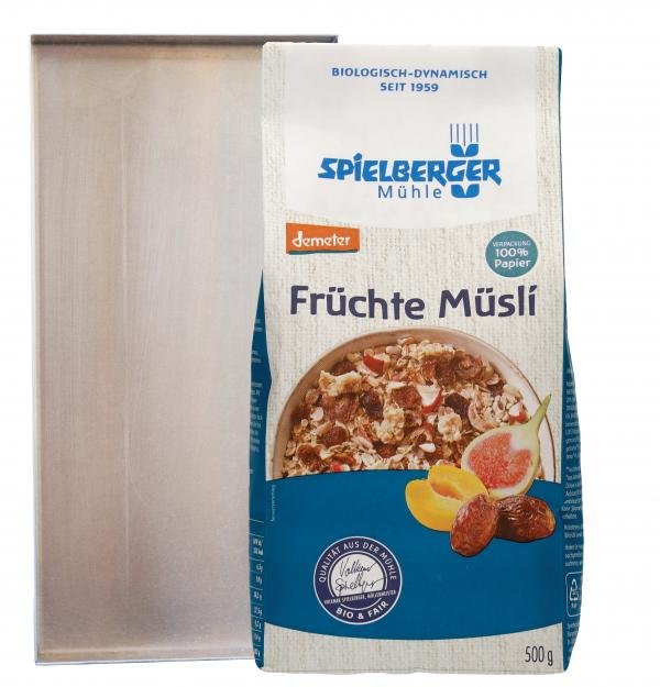Für das Früchte Müsli werden beste Hafer- und Dinkelflocken verwendet, die in der eigenen Flockenmühle mit größter Sorgfalt hergestellt werden. Aromatische Sultaninen, Aprikosen, Äpfel, Datteln und Feigen machen das Müsli richtig schön fruchtig, bringen eine feine Süße und wertvolle Ballaststoffe. Knuspriges Hafer Crunchy und knackige Saaten sorgen für den nötigen Biss in der Mischung. Ein Müsli für alle, die eine geballte Ladung leckere Früchte lieben.