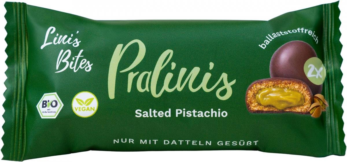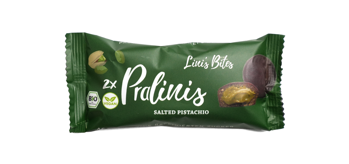 Bei Lini's Bites Pralinis handelt es sich um mit aromatischer Schokolade umhüllte, weiche Kekskugeln. In ihnen versteckt sich eine herrlich cremige Füllung. Wie alle Produkte der Lini's Bites Familie, sind auch unsere Energie-Pralinen vegan, glutenfrei sowie frei von raffiniertem Zucker, Palmöl und Soja. Dabei verwenden wir ausschließlich hochwertige Zutaten aus kontrolliert biologischem Anbau. In jeder Packung sind zwei Lini’s Bites Pralinis enthalten - perfekt als Snack für Zwischendurch, zum Teilen mit Freunden oder Kollegen, oder als doppelte Belohnung für dich selbst! Erhältlich in vier innovativen Geschmacksrichtungen! Die Sorte Salted Pistachio besticht durch eine zartschmelzende Pistazien-Creme.