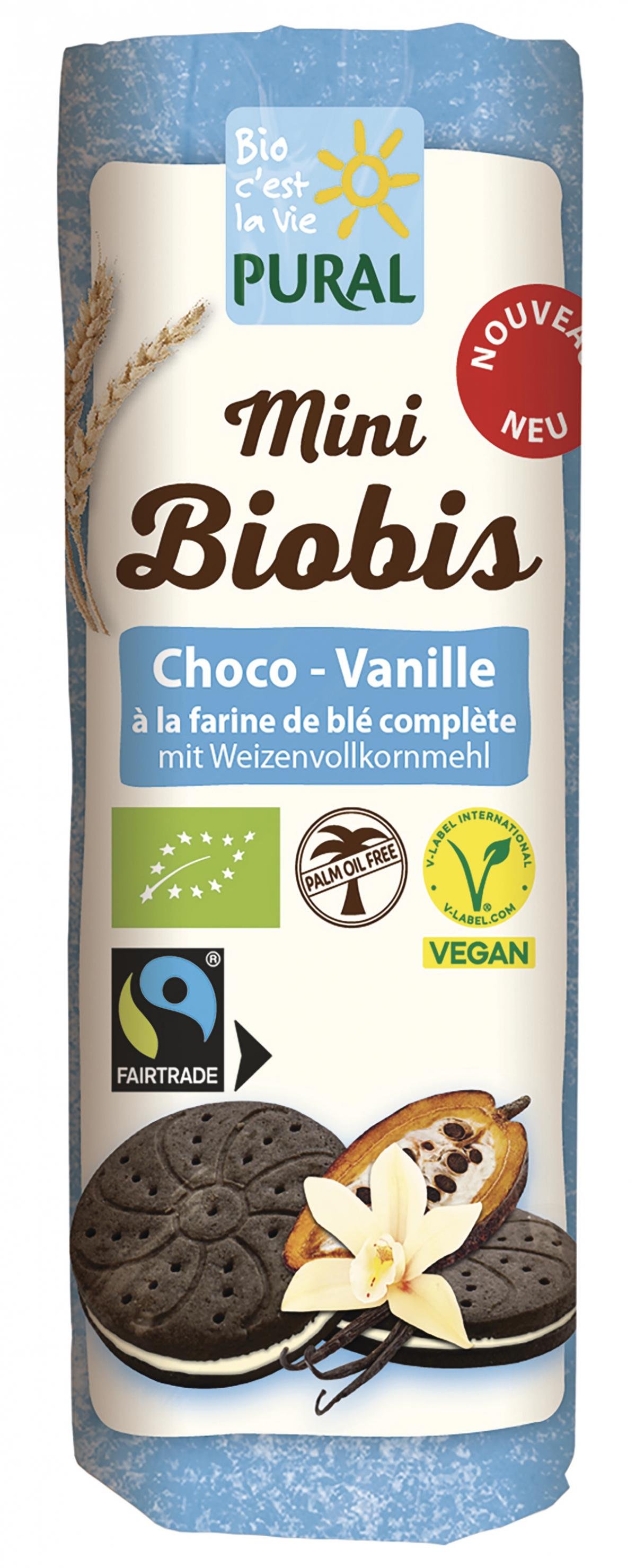 Genießen Sie den Geschmack eines dunkles kakaoreichen Kekses in Kombination mit einer hellen zarten Bourbon-Vanillecreme. Die neuen Mini Biobis Choco-Vanille sind ganz ohne Palmöl, Fairtrade, vegan und enthalten weizen Vollkornmehl. Ideal für die ganze Familie, sie respektieren durch ihre nachhaltige Wertschöpfung sowohl Mensch als auch Natur.